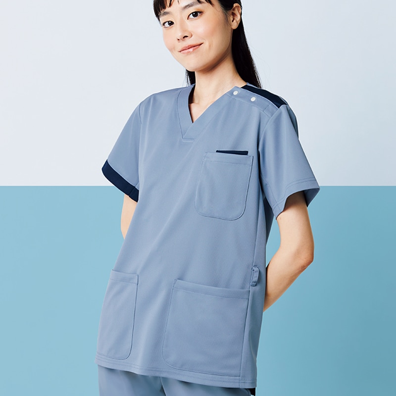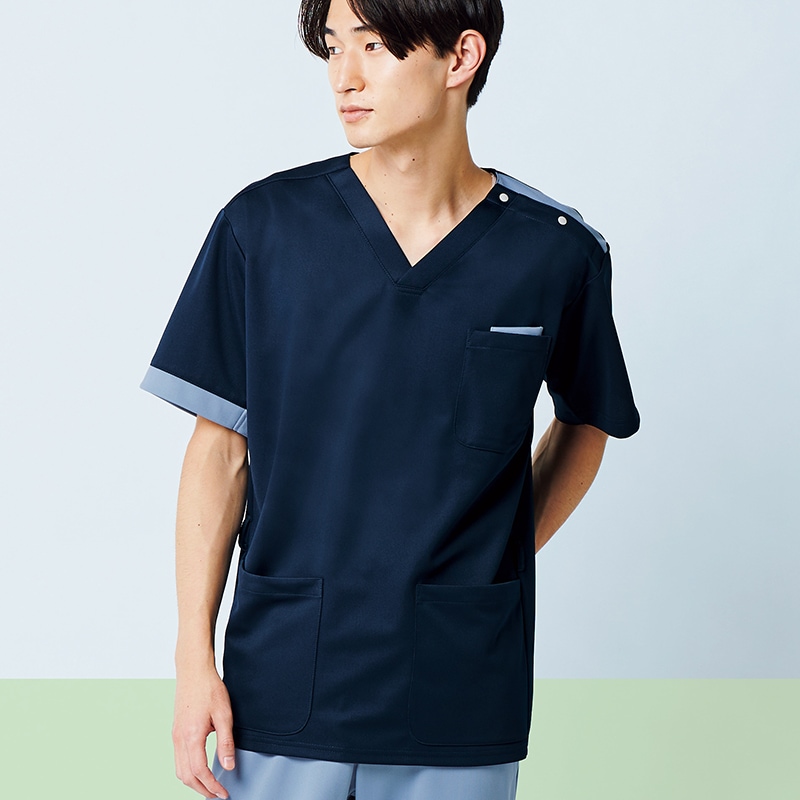 ネイビー配色やカラースナップボタンがアクセントの新型スクラブもおすすめです。
